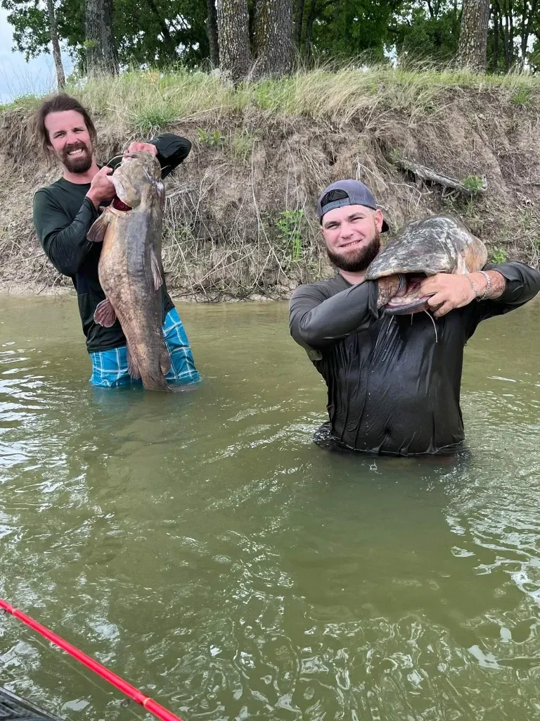 Flathead Catfish: Now we're talking about the true monsters of Lake Tawakoni. Flatheads, also called yellow cats or mudcats, can grow to over 60 pounds in these waters. They prefer deeper, darker holes and are most active at night, which adds an extra layer of excitement to noodling for them. Flatheads are ambush predators, so when you find one in its lair, be prepared for an explosive reaction. Their broad, flat heads can make them tricky to grab, but that's all part of the challenge. Late spring through summer is your best bet for tangling with these bruisers.
